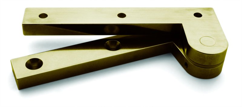 The Brusso L-19 brass offset pivot hinge is employed when a minimum of visible hardware is desired or when the door must swing free of its frame. It is morticed into the top and bottom of the door and frame; only the pivot is visible. The leaf measures 5" x 3/4" x 3/8".