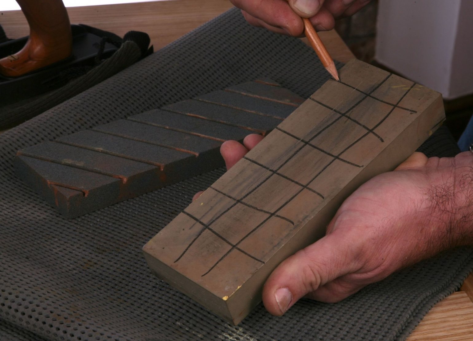 Despite their durability, waterstones wear down and require regular maintenance to keep their surface flat and effective. Flattening your waterstone is straightforward: simply draw a grid on the stone with a pencil and rub it against a known flat surface, such as a piece of glass with wet abrasive paper or a diamond flattening plate, until the pencil marks disappear, indicating a level surface.