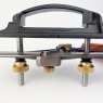 The asymmetric fence grip is sculpted to comfortably fit the natural curvatures of the hand. Double guide rods and a special collet locking system prevent the fence from racking. Large brass knobs make adjustments fast and easy without need for tools; the fence can be offset from flush to 1½'' from the blade.